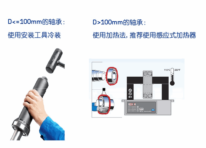 熱裝法是將軸承放在油中加熱到80℃-100℃,使軸承內(nèi)孔脹大后套裝到軸上,可防止軸和軸承免受損傷。對(duì)于帶防塵蓋和密封圈,內(nèi)部已充滿潤(rùn)滑脂的軸承不適用熱裝法。