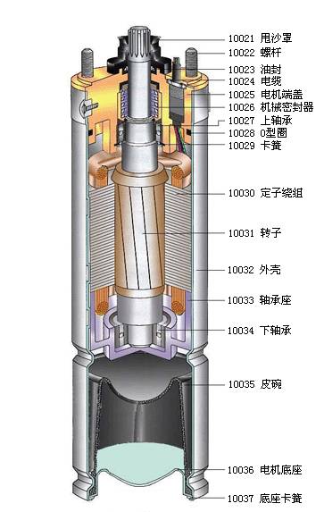 井用潛水泵是由泵體、揚水管、泵座、潛水電機(包括電纜)和起動保護裝置等組成。泵體是潛水泵的工作部件,它由進水段、導流殼、逆止閥、泵軸和葉輪等零部件組成。葉輪在軸上的固定有兩種方式:150QJ30型、200QJ80型、250QJ80型和QJC型的葉輪是用錐形套緊固在泵軸上;其它型號的葉輪則用鍵和軸套固定在泵軸上。導流殼之間用螺栓連接;150QJT15型的整個泵體則用四根扁拉筋緊固。泵體與潛水電機之間采用法蘭面用螺栓連接,兩軸則用聯(lián)軸器連接。揚水管間也用螺栓連接。電機為立式運行的充水式井用潛水三相異步電動機,配帶的電纜為防水橡套電纜,起動保護裝置應選用具有過載、欠壓、斷相等保護功能的自藕減壓起動箱。