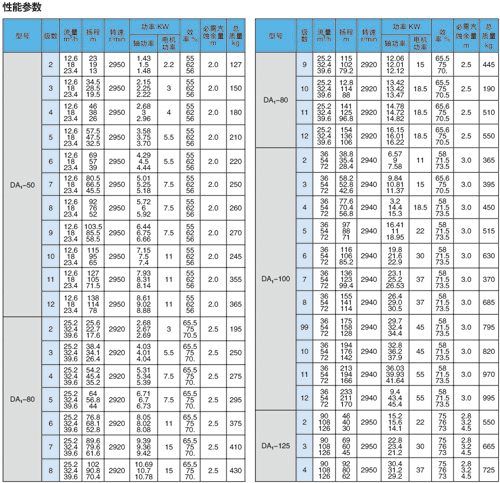 型號(hào)意義:如DA1-100X5:100-泵進(jìn)、出口直徑,5-泵的級(jí)數(shù)。